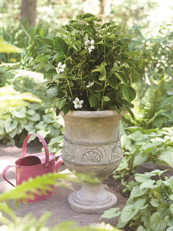 Thornless and easy to grow! Enjoy large, sweet berries from compact, upright plants. Decorative and edible, this dwarf blackberry plant will even liven up your patio or entryway. Grows well in containers! Fall-bearing (everbearing) primocane with a summer crop. Floricane berries ripen in July. Primocane berries ripen in September through frost. Self-pollinating. May be covered by USPP #27,032 or other patents. APF-236T cultivar