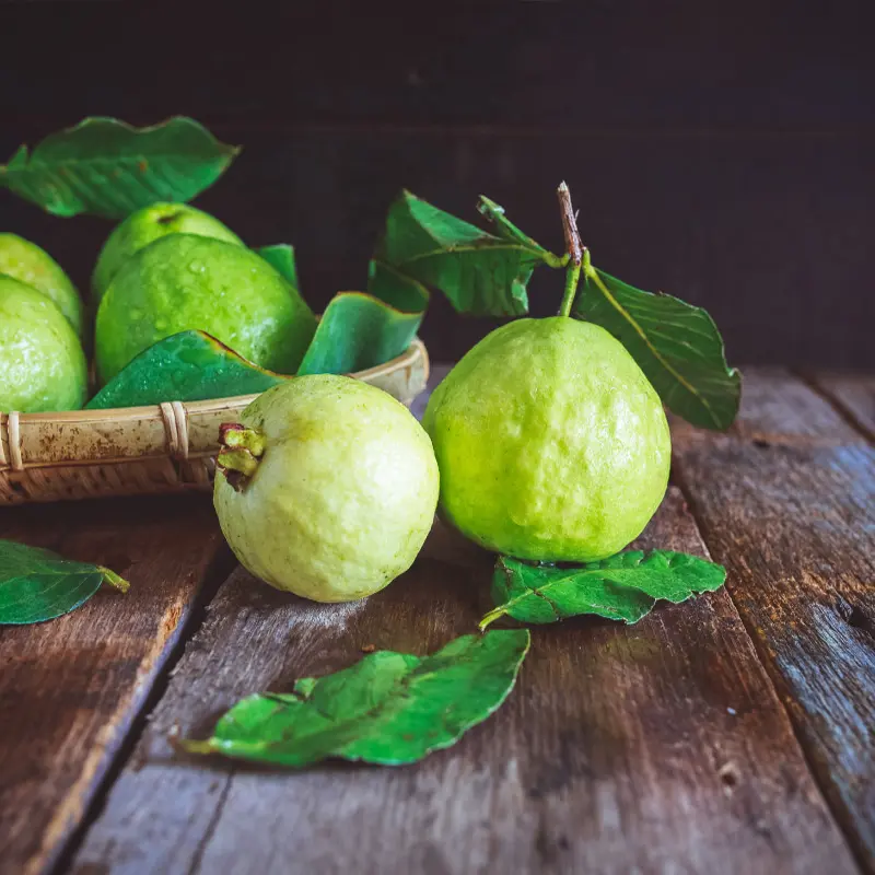 Pineapple guavas, botanically classified as Acca sellowiana, are subtropical, aromatic fruits belonging to the Myrtaceae family. The tree produces unique and sugar-sweet edible flowers, followed by kiwi-sized fruits with a tropical fragrance. Though not true guavas, these fruits offer a sweet-tart, tropical flavor reminiscent of strawberries, pineapples, and apples. Their remarkable red to white flowers attract bees, birds, and butterflies, making it a delightful addition to any garden.
